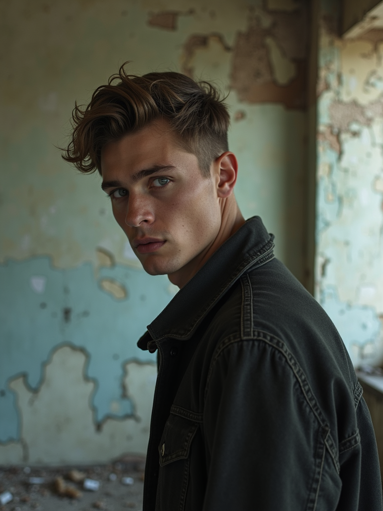model posing in front of abandoned derelict Soviet era Russian block of 1950s flats. crumbling walls, fallen off tiles. in terrible condition. haunted atmosphere.