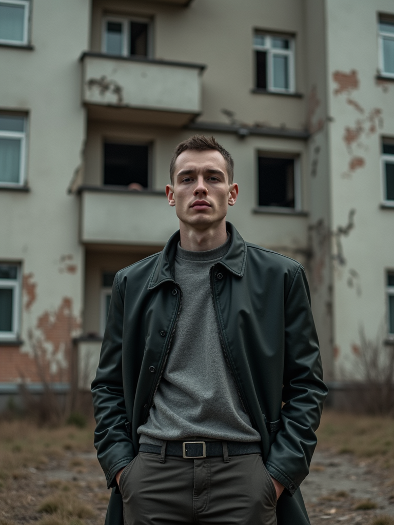 model posing in front of abandoned derelict Soviet era Russian block of 1950s flats. crumbling walls, fallen off tiles. in terrible condition. haunted atmosphere.
