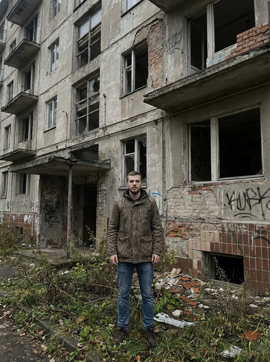 model posing in front of abandoned derelict Soviet era Russian block of 1950s flats. crumbling walls, fallen off tiles. in terrible condition. haunted atmosphere.