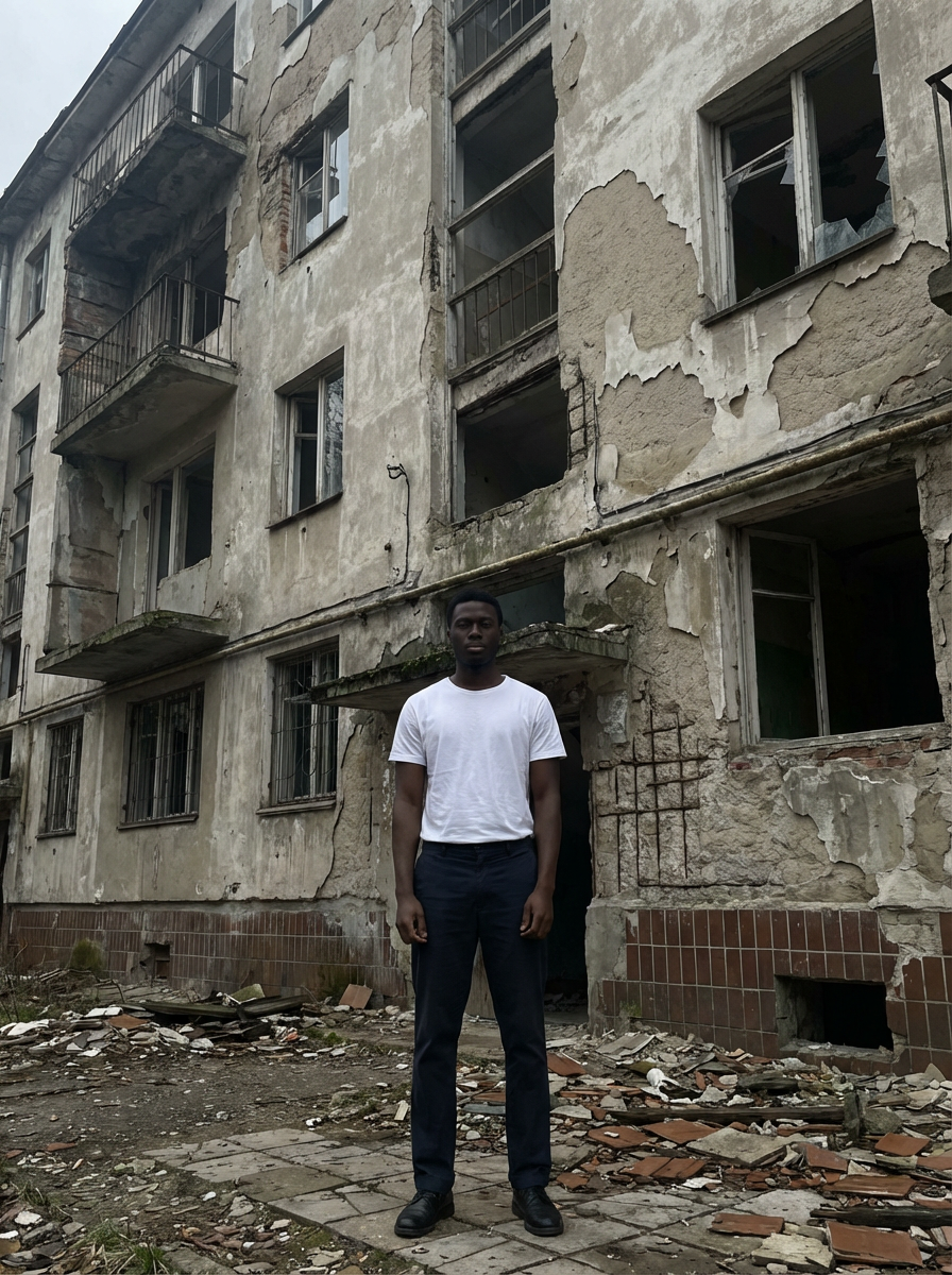 model posing in front of abandoned derelict Soviet era Russian block of 1950s flats. crumbling walls, fallen off tiles. in terrible condition. haunted atmosphere.