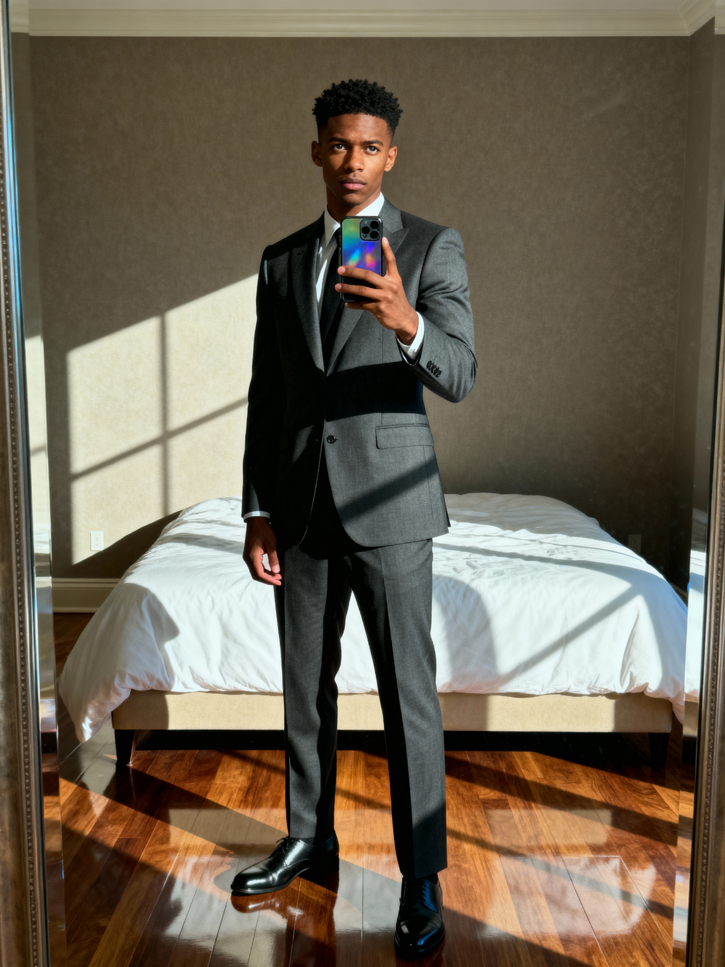 model posing in front of mirror wearing a elegant suit. the model's left hand is visible holding a phone in front of their face, while the right arm rests by their side. the setting includes a light-colored bed and a neutral-colored wall, with natural light casting soft shadows on the floor.