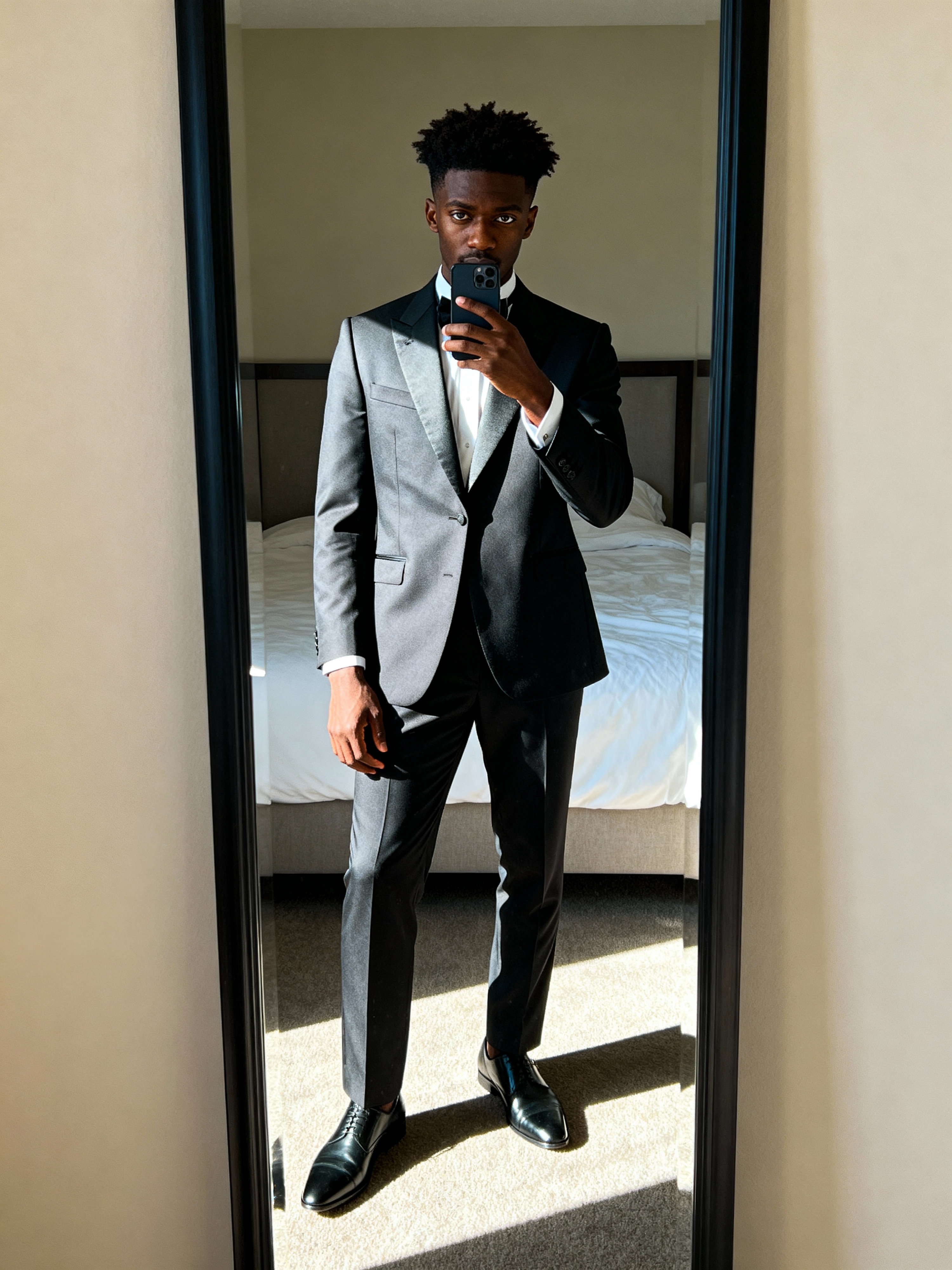 model posing in front of mirror wearing a elegant suit. the model's left hand is visible holding a phone in front of their face, while the right arm rests by their side. the setting includes a light-colored bed and a neutral-colored wall, with natural light casting soft shadows on the floor.