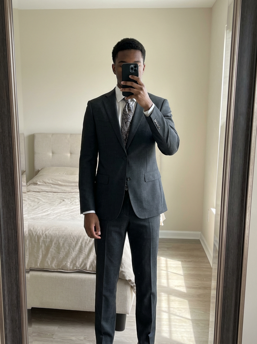 model posing in front of mirror wearing a elegant suit. the model's left hand is visible holding a phone in front of their face, while the right arm rests by their side. the setting includes a light-colored bed and a neutral-colored wall, with natural light casting soft shadows on the floor.