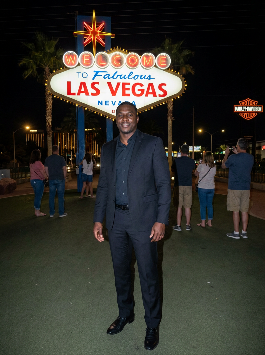 model posing in front of the famous Welcome to the Fabulous Las Vegas Nevada sign at night. camera flash. the model wears a fitted blazer and dress pants