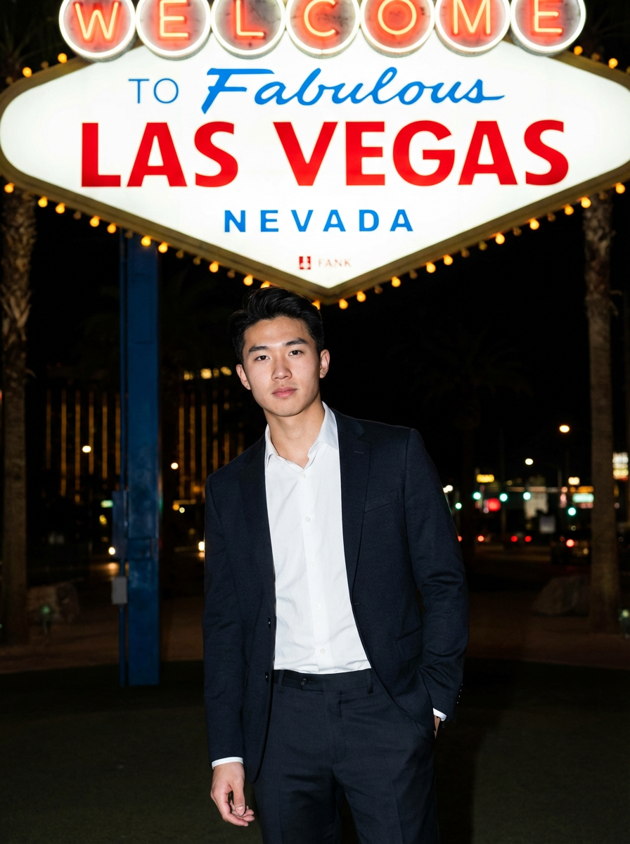 model posing in front of the famous Welcome to the Fabulous Las Vegas Nevada sign at night. camera flash. the model wears a fitted blazer and dress pants