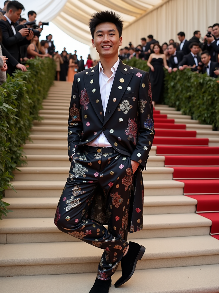 model posing on the iconic Met steps decorated for the gala, wearing a fashion-forward suit with artistic elements, surrounded by photographers and fashion elite, Met Gala signage and red carpet visible