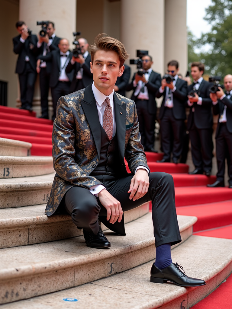 model posing on the iconic Met steps decorated for the gala, wearing a fashion-forward suit with artistic elements, surrounded by photographers and fashion elite, Met Gala signage and red carpet visible