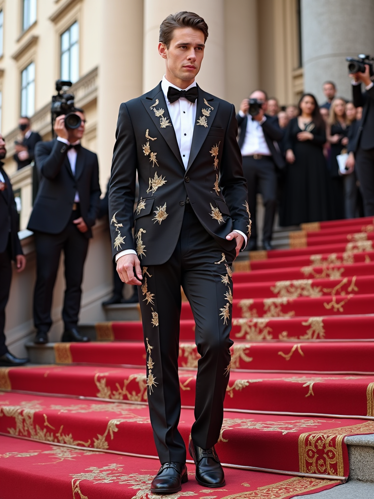 model posing on the iconic Met steps decorated for the gala, wearing a fashion-forward suit with artistic elements, surrounded by photographers and fashion elite, Met Gala signage and red carpet visible