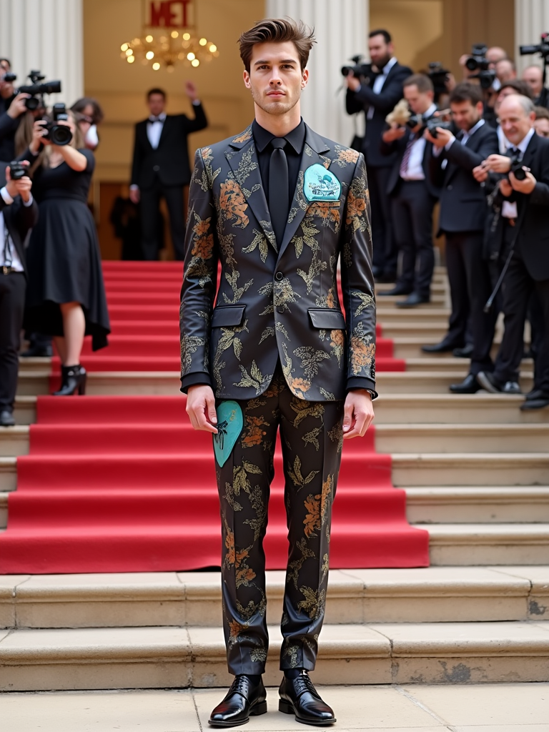 model posing on the iconic Met steps decorated for the gala, wearing a fashion-forward suit with artistic elements, surrounded by photographers and fashion elite, Met Gala signage and red carpet visible