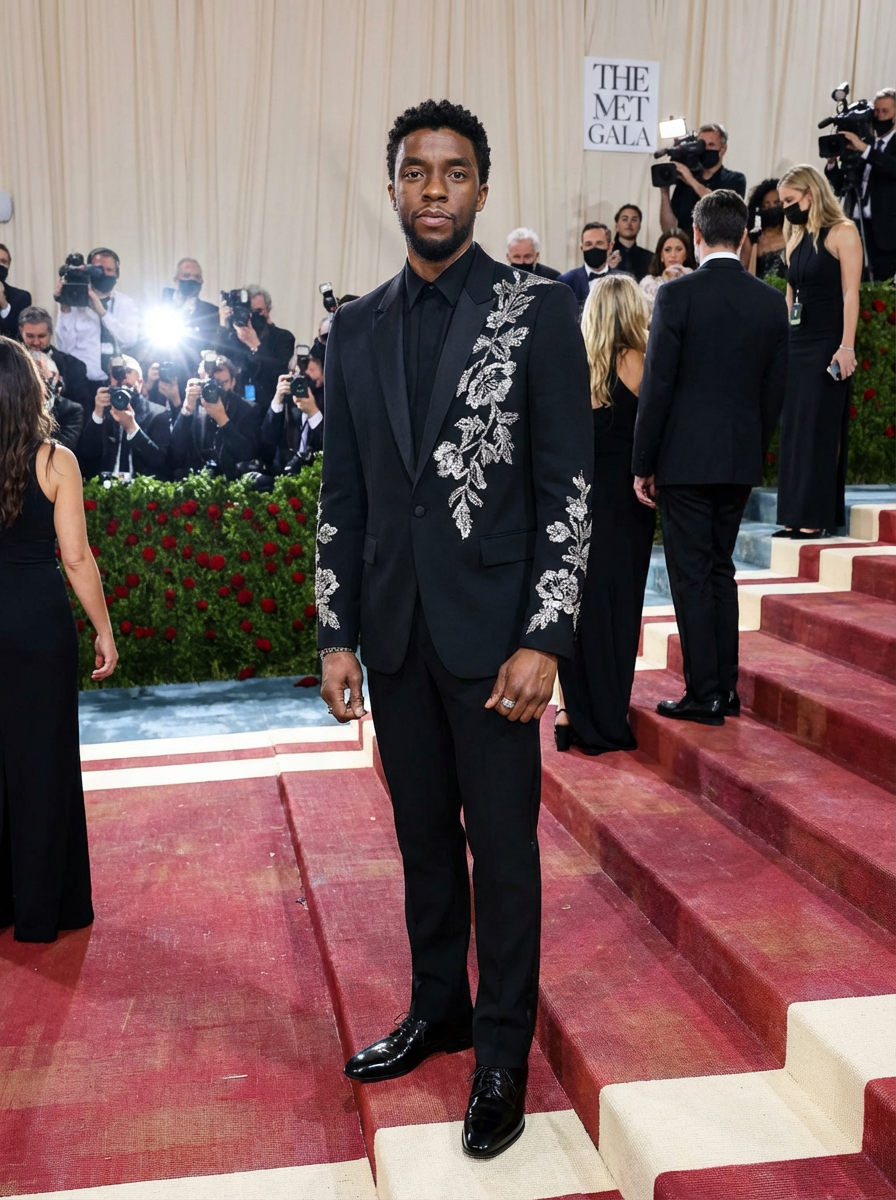 model posing on the iconic Met steps decorated for the gala, wearing a fashion-forward suit with artistic elements, surrounded by photographers and fashion elite, Met Gala signage and red carpet visible