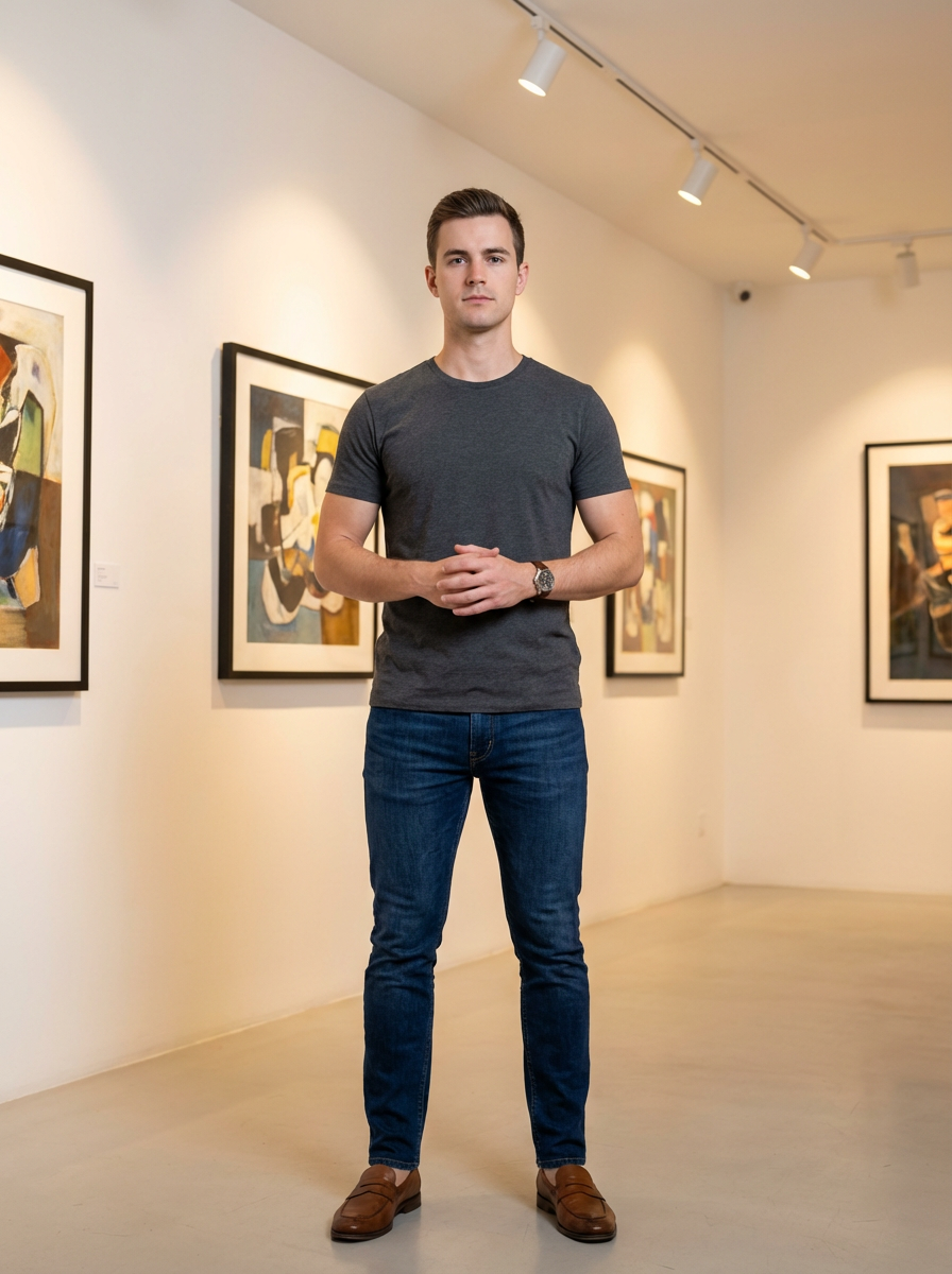 model quiet luxury casual, premium cotton t-shirt, perfectly fitted jeans, leather loafers, art gallery setting