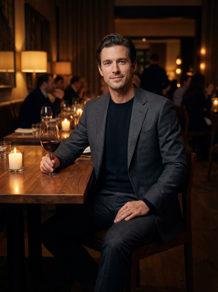 model quiet luxury dinner look, fine wool suit no tie, upscale restaurant, candlelit