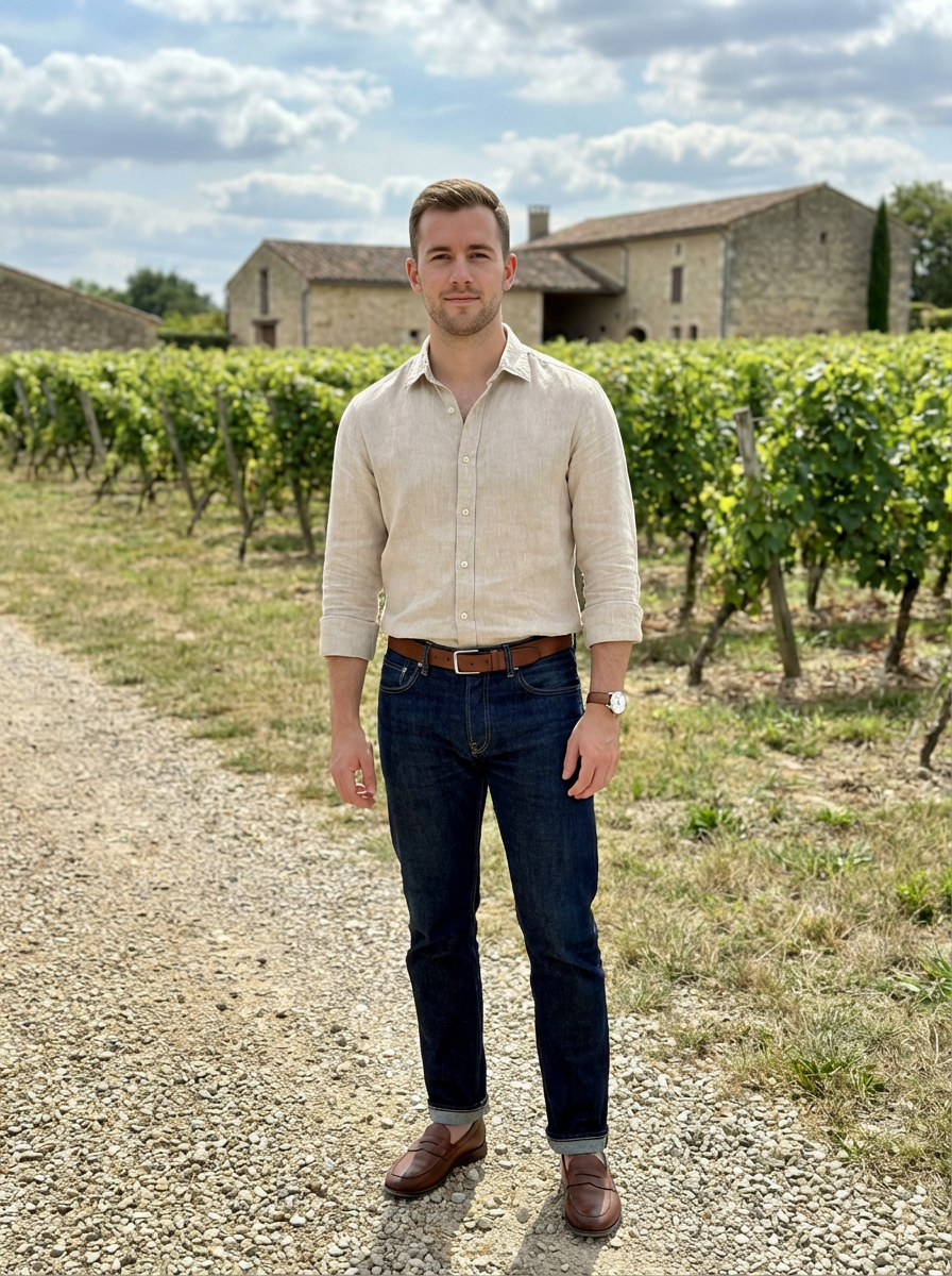 model quiet luxury weekend, linen shirt, quality denim, leather accessories, vineyard or estate setting