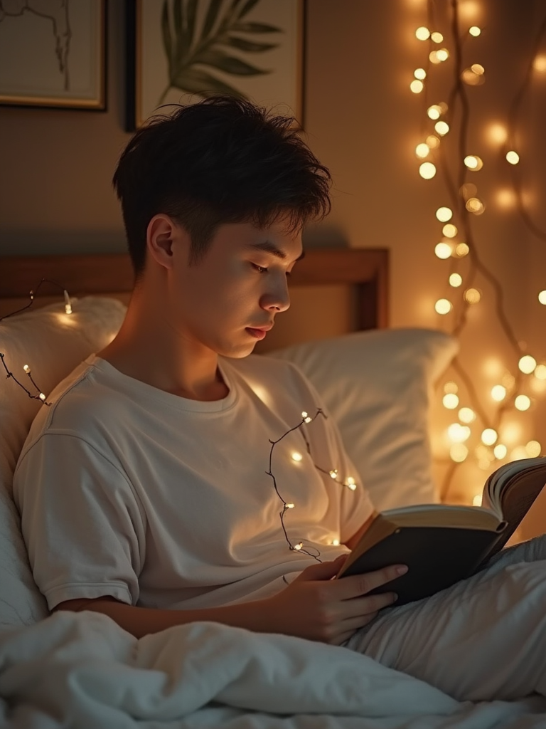 model reading book in bed, wearing comfortable cotton sleepwear, surrounded by soft pillows and blankets, fairy lights in background, golden hour lighting, peaceful weekend morning