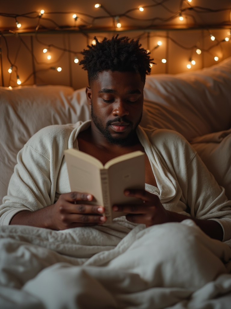 model reading book in bed, wearing comfortable cotton sleepwear, surrounded by soft pillows and blankets, fairy lights in background, golden hour lighting, peaceful weekend morning