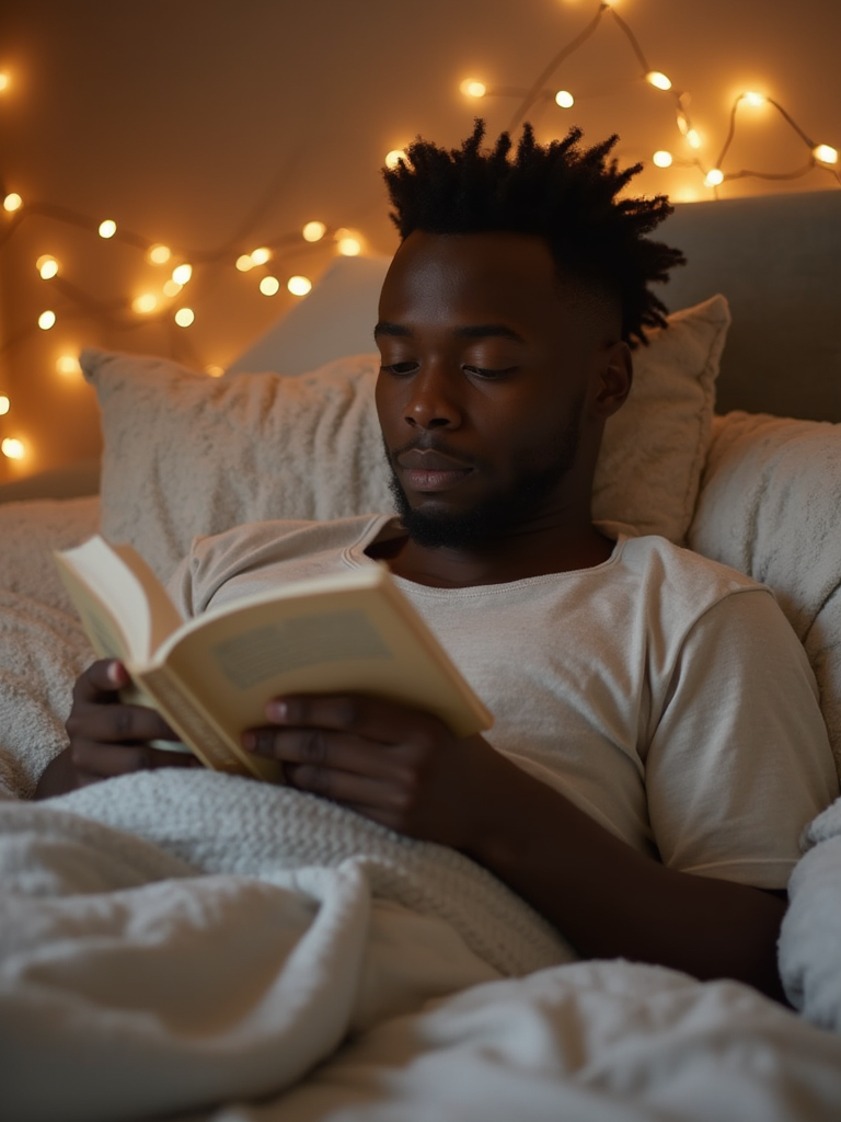 model reading book in bed, wearing comfortable cotton sleepwear, surrounded by soft pillows and blankets, fairy lights in background, golden hour lighting, peaceful weekend morning