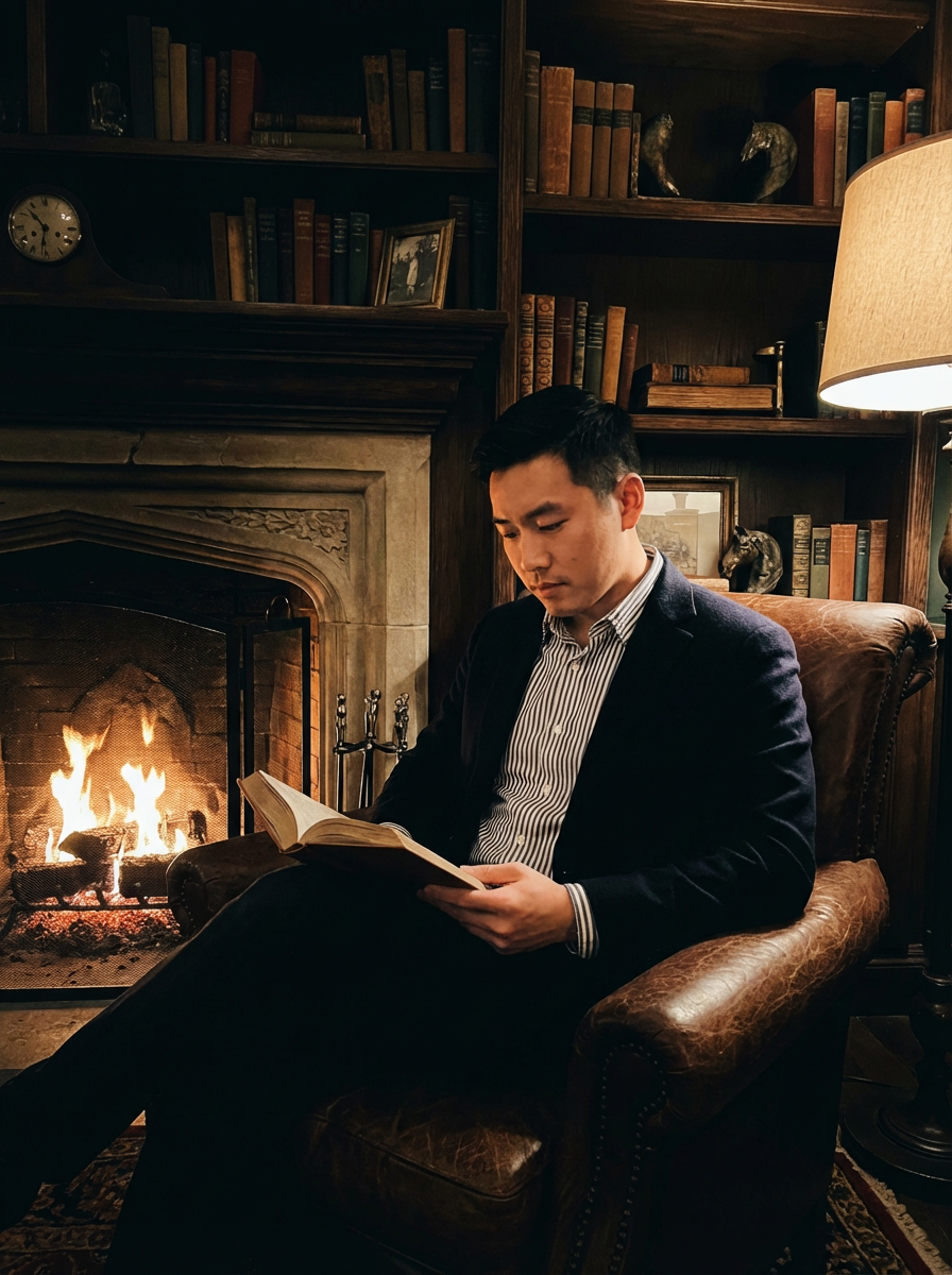model reading in dark academia setting, leather armchair, fireplace glow, warm amber lighting, cozy intellectual vibe