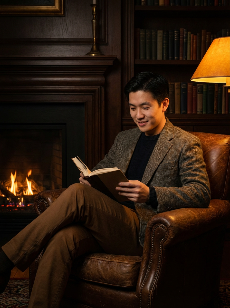 model reading in dark academia setting, leather armchair, fireplace glow, warm amber lighting, cozy intellectual vibe