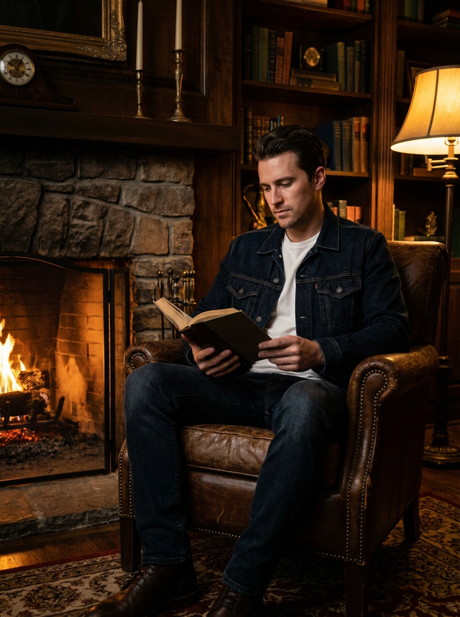 model reading in dark academia setting, leather armchair, fireplace glow, warm amber lighting, cozy intellectual vibe