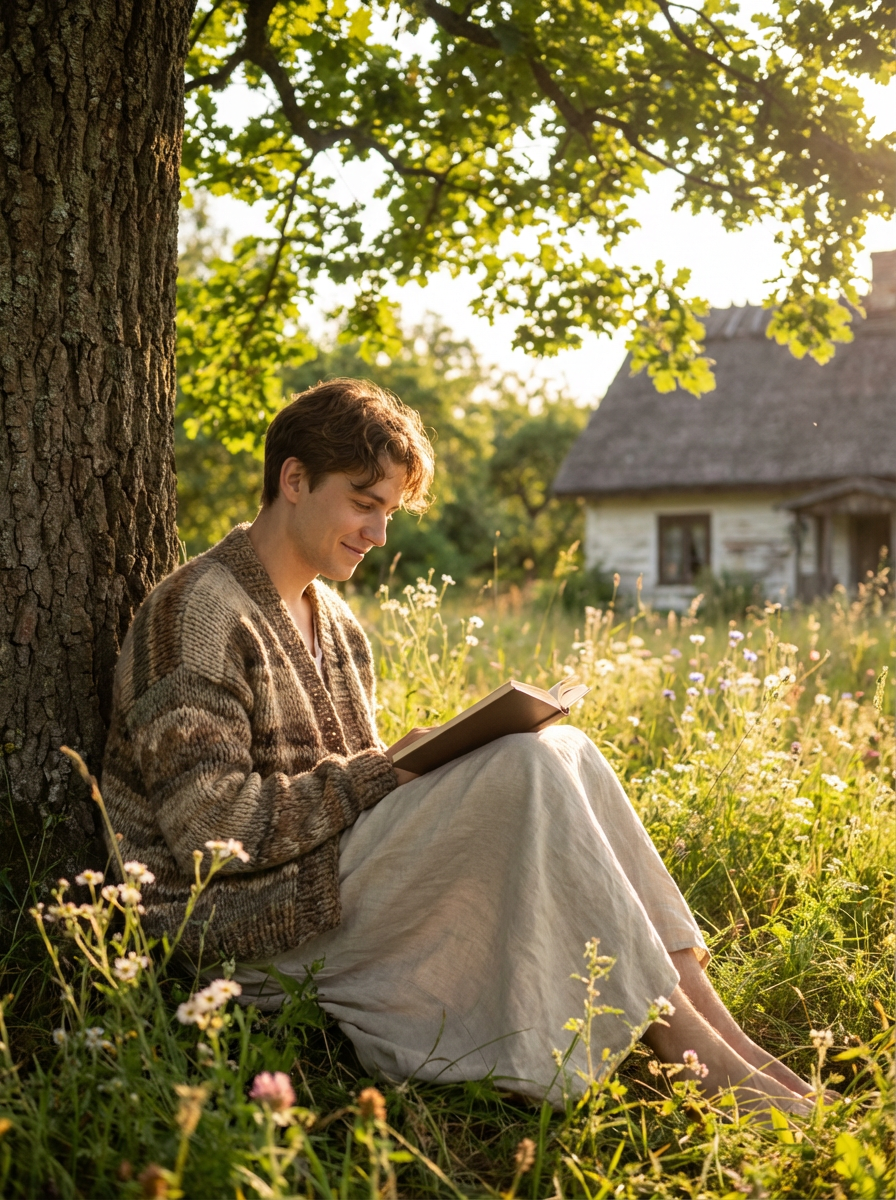 model reading under tree, cottagecore style, flowing skirt, handmade knit cardigan, golden hour meadow
