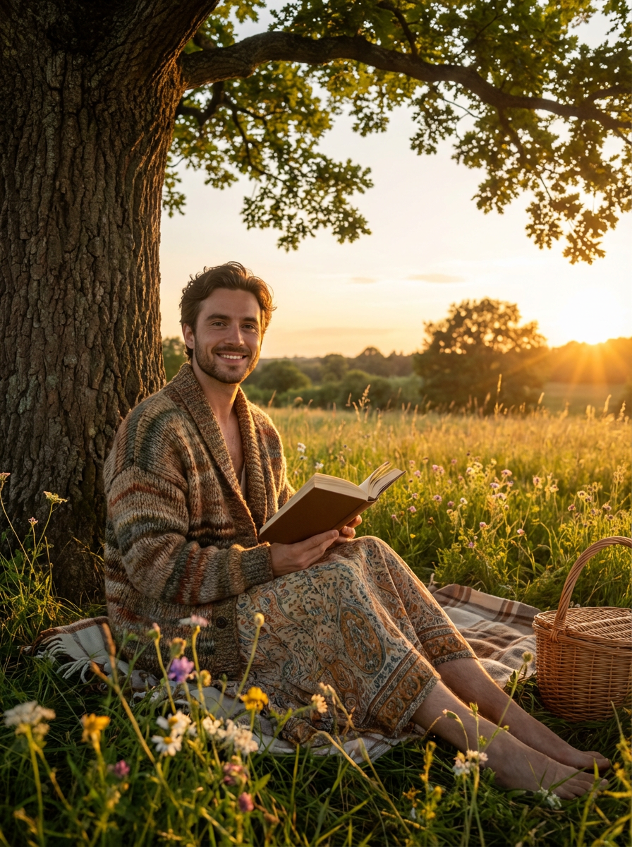 model reading under tree, cottagecore style, flowing skirt, handmade knit cardigan, golden hour meadow