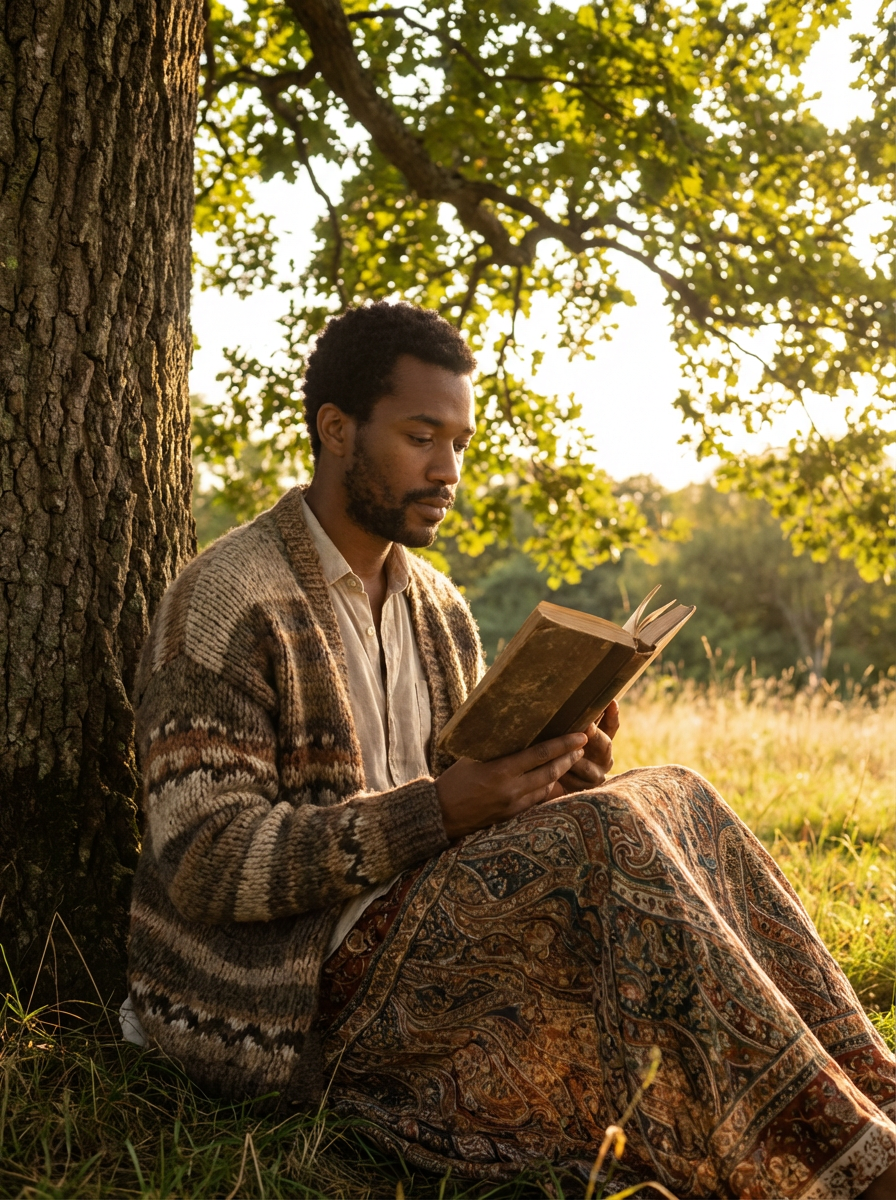 model reading under tree, cottagecore style, flowing skirt, handmade knit cardigan, golden hour meadow