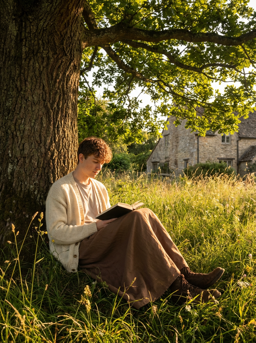 model reading under tree, cottagecore style, flowing skirt, handmade knit cardigan, golden hour meadow