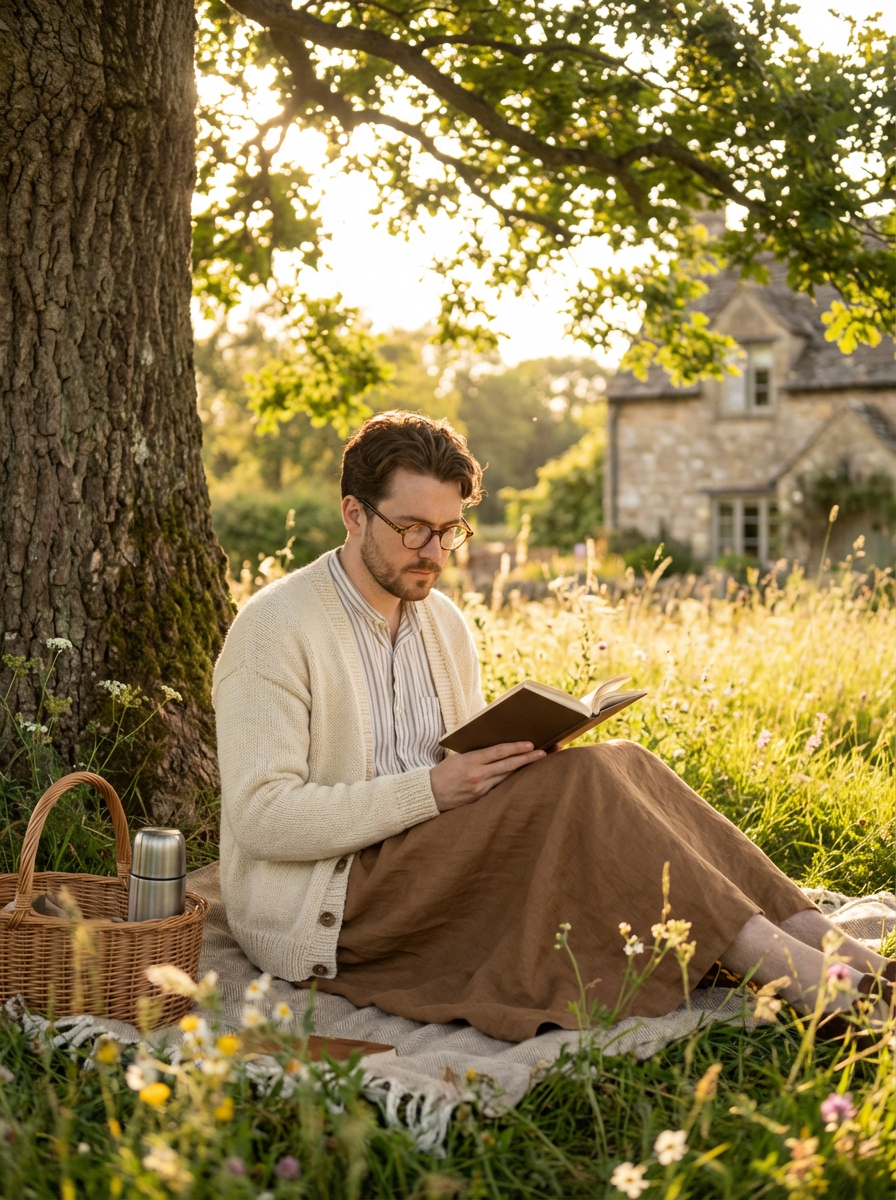 model reading under tree, cottagecore style, flowing skirt, handmade knit cardigan, golden hour meadow