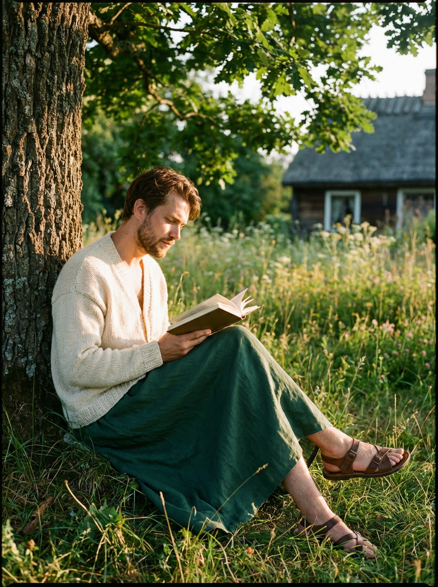 model reading under tree, cottagecore style, flowing skirt, handmade knit cardigan, golden hour meadow