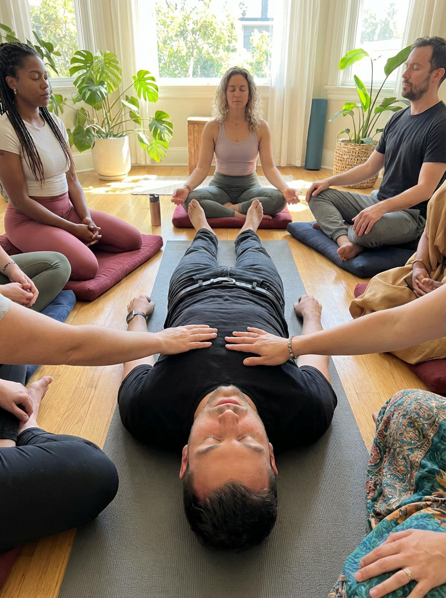model receiving energy healing in a healing circle