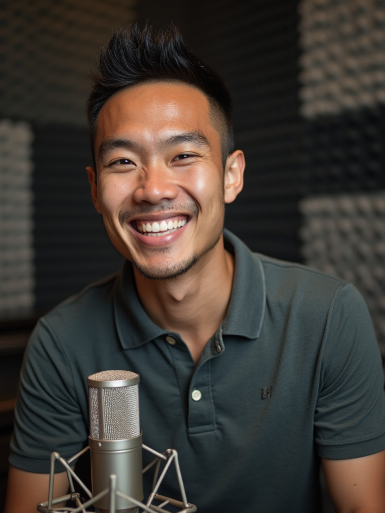 model recording podcast, wearing polo shirt, large microphone in front, soundproofing panels in background, professional studio setup, engaging expression