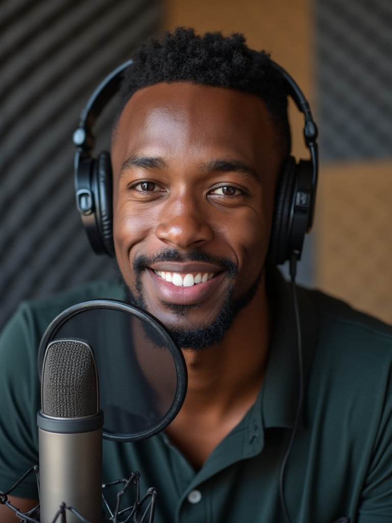 model recording podcast, wearing polo shirt, large microphone in front, soundproofing panels in background, professional studio setup, engaging expression