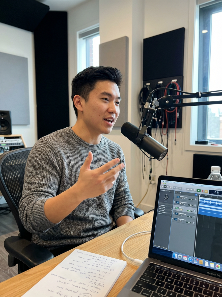 model recording solo podcast, wearing casual sweater, dynamic arm microphone, laptop and notes visible, energetic expression, modern studio environment