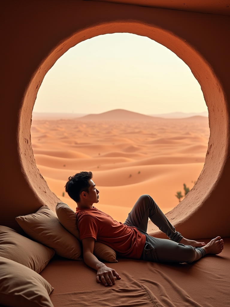 model relaxing in a Mars habitat lounge area. Mars red dunes is visible in big windows. model wears a casual t-shirt and sweatpants.