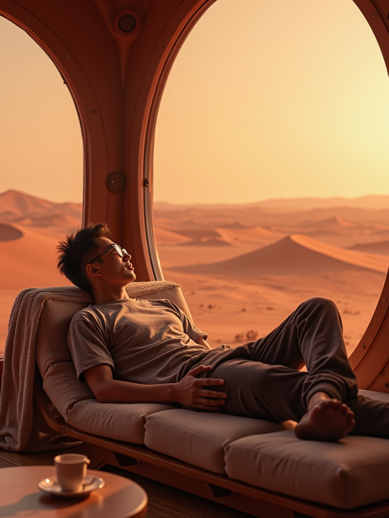 model relaxing in a Mars habitat lounge area. Mars red dunes is visible in big windows. model wears a casual t-shirt and sweatpants.