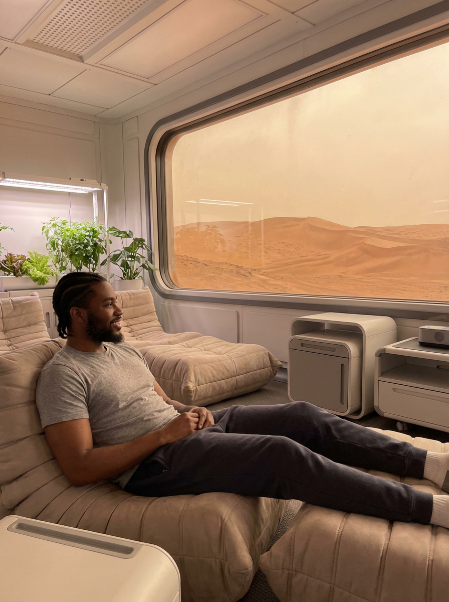 model relaxing in a Mars habitat lounge area. Mars red dunes is visible in big windows. model wears a casual t-shirt and sweatpants.