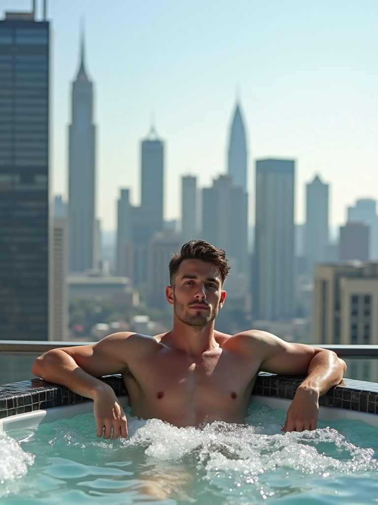 model relaxing in a rooftop jacuzzi with a modern city skyline in the background. mans leans casually on the edge of the jacuzzi, with water bubbling around them. The backdrop showcases tall skyscrapers and an urban environment under bright daylight, creating a luxurious, high-end vibe.