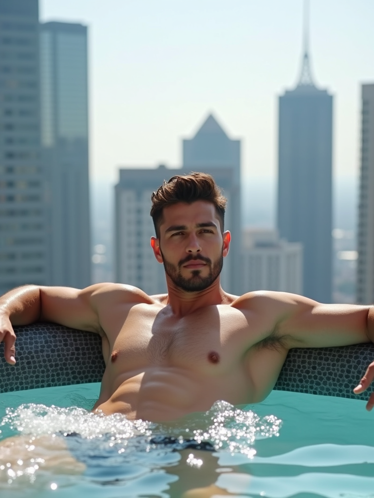 model relaxing in a rooftop jacuzzi with a modern city skyline in the background. mans leans casually on the edge of the jacuzzi, with water bubbling around them. The backdrop showcases tall skyscrapers and an urban environment under bright daylight, creating a luxurious, high-end vibe.