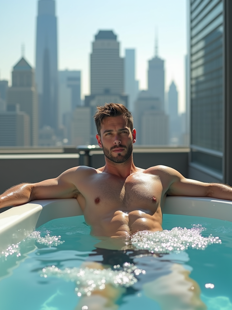 model relaxing in a rooftop jacuzzi with a modern city skyline in the background. mans leans casually on the edge of the jacuzzi, with water bubbling around them. The backdrop showcases tall skyscrapers and an urban environment under bright daylight, creating a luxurious, high-end vibe.