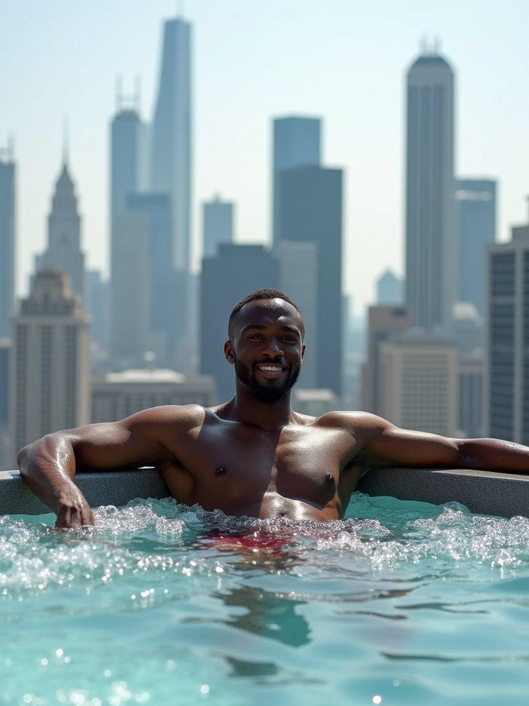 model relaxing in a rooftop jacuzzi with a modern city skyline in the background. mans leans casually on the edge of the jacuzzi, with water bubbling around them. The backdrop showcases tall skyscrapers and an urban environment under bright daylight, creating a luxurious, high-end vibe.