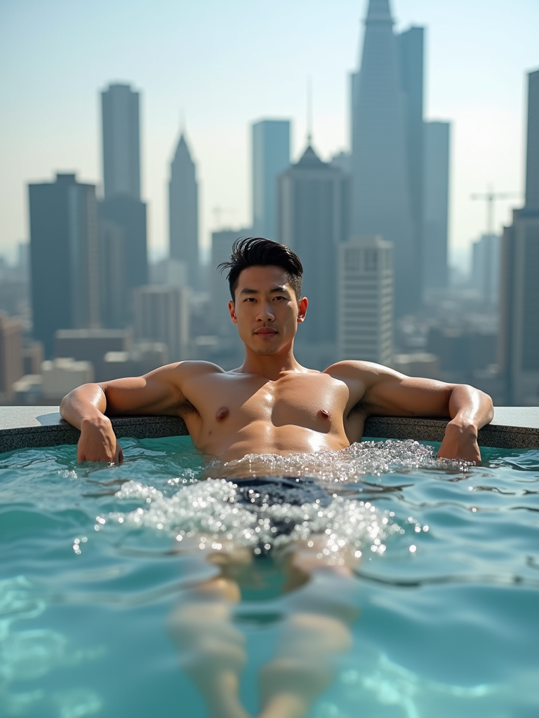 model relaxing in a rooftop jacuzzi with a modern city skyline in the background. mans leans casually on the edge of the jacuzzi, with water bubbling around them. The backdrop showcases tall skyscrapers and an urban environment under bright daylight, creating a luxurious, high-end vibe.