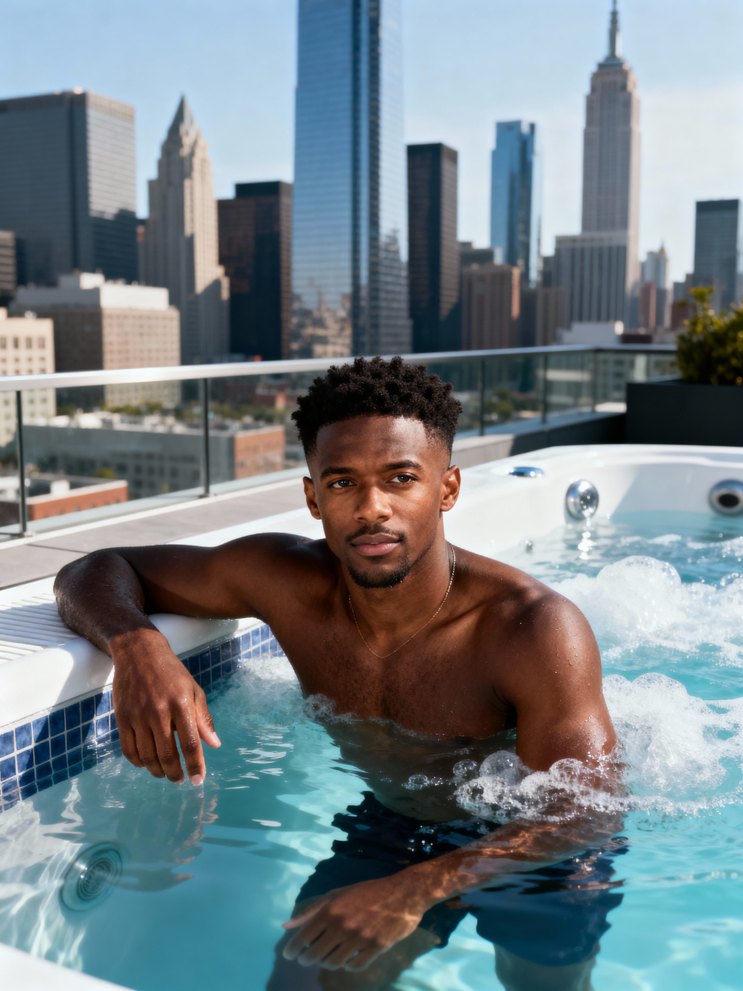 model relaxing in a rooftop jacuzzi with a modern city skyline in the background. mans leans casually on the edge of the jacuzzi, with water bubbling around them. The backdrop showcases tall skyscrapers and an urban environment under bright daylight, creating a luxurious, high-end vibe.