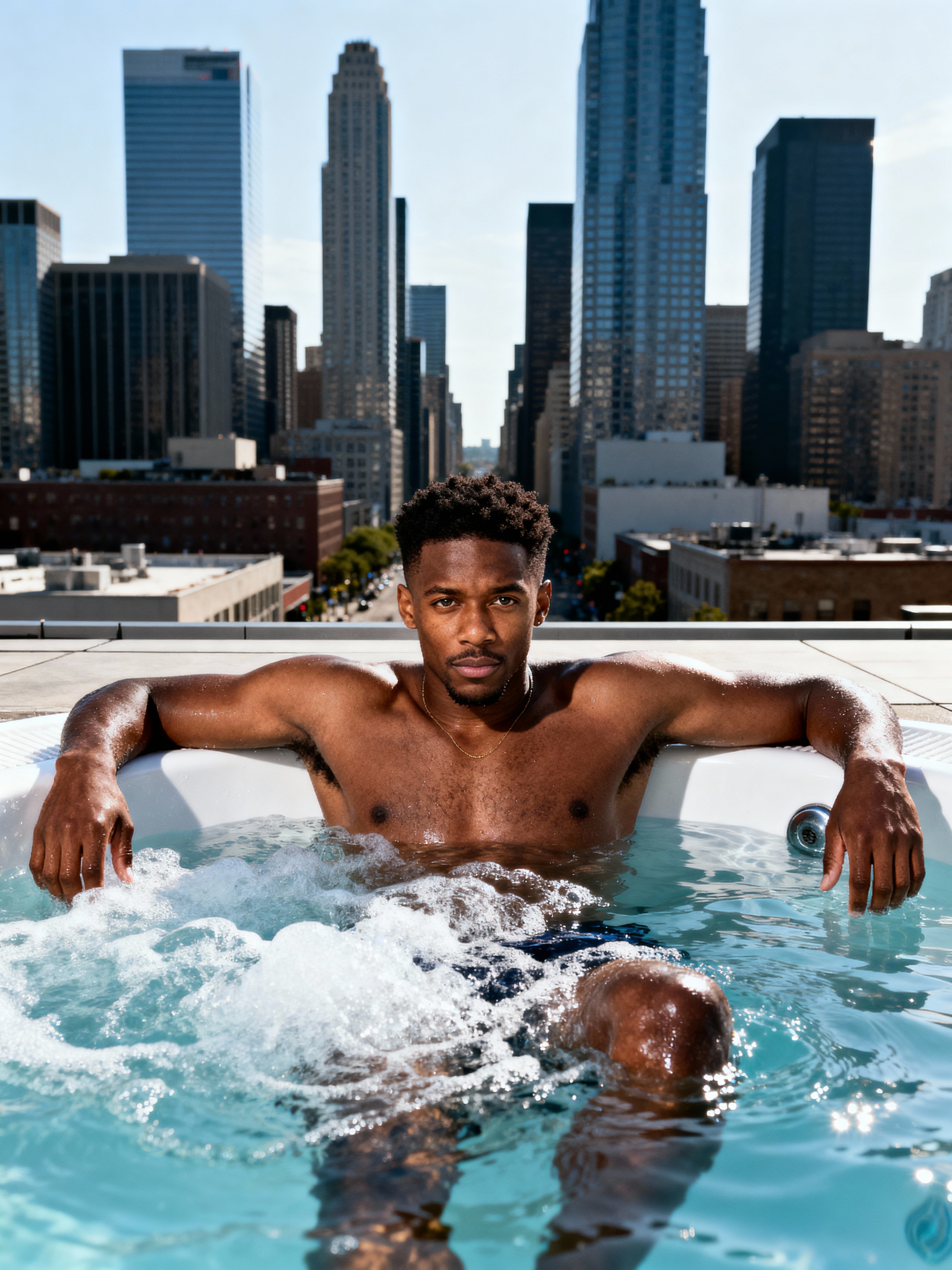 model relaxing in a rooftop jacuzzi with a modern city skyline in the background. mans leans casually on the edge of the jacuzzi, with water bubbling around them. The backdrop showcases tall skyscrapers and an urban environment under bright daylight, creating a luxurious, high-end vibe.