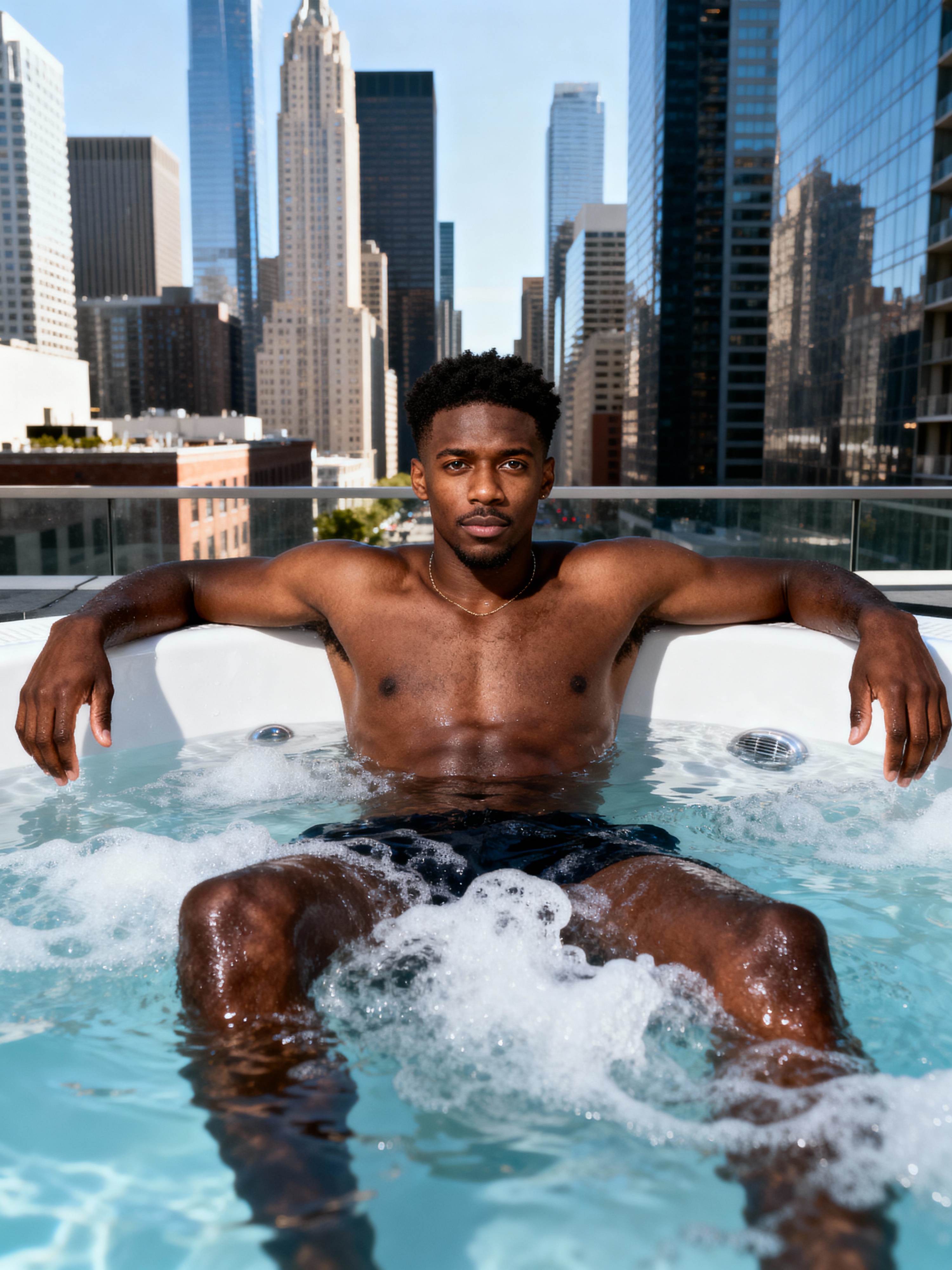 model relaxing in a rooftop jacuzzi with a modern city skyline in the background. mans leans casually on the edge of the jacuzzi, with water bubbling around them. The backdrop showcases tall skyscrapers and an urban environment under bright daylight, creating a luxurious, high-end vibe.
