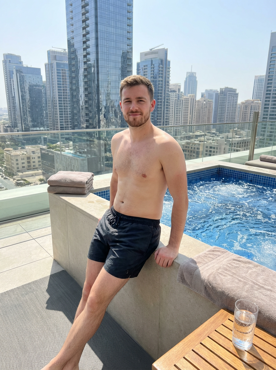 model relaxing in a rooftop jacuzzi with a modern city skyline in the background. mans leans casually on the edge of the jacuzzi, with water bubbling around them. The backdrop showcases tall skyscrapers and an urban environment under bright daylight, creating a luxurious, high-end vibe.