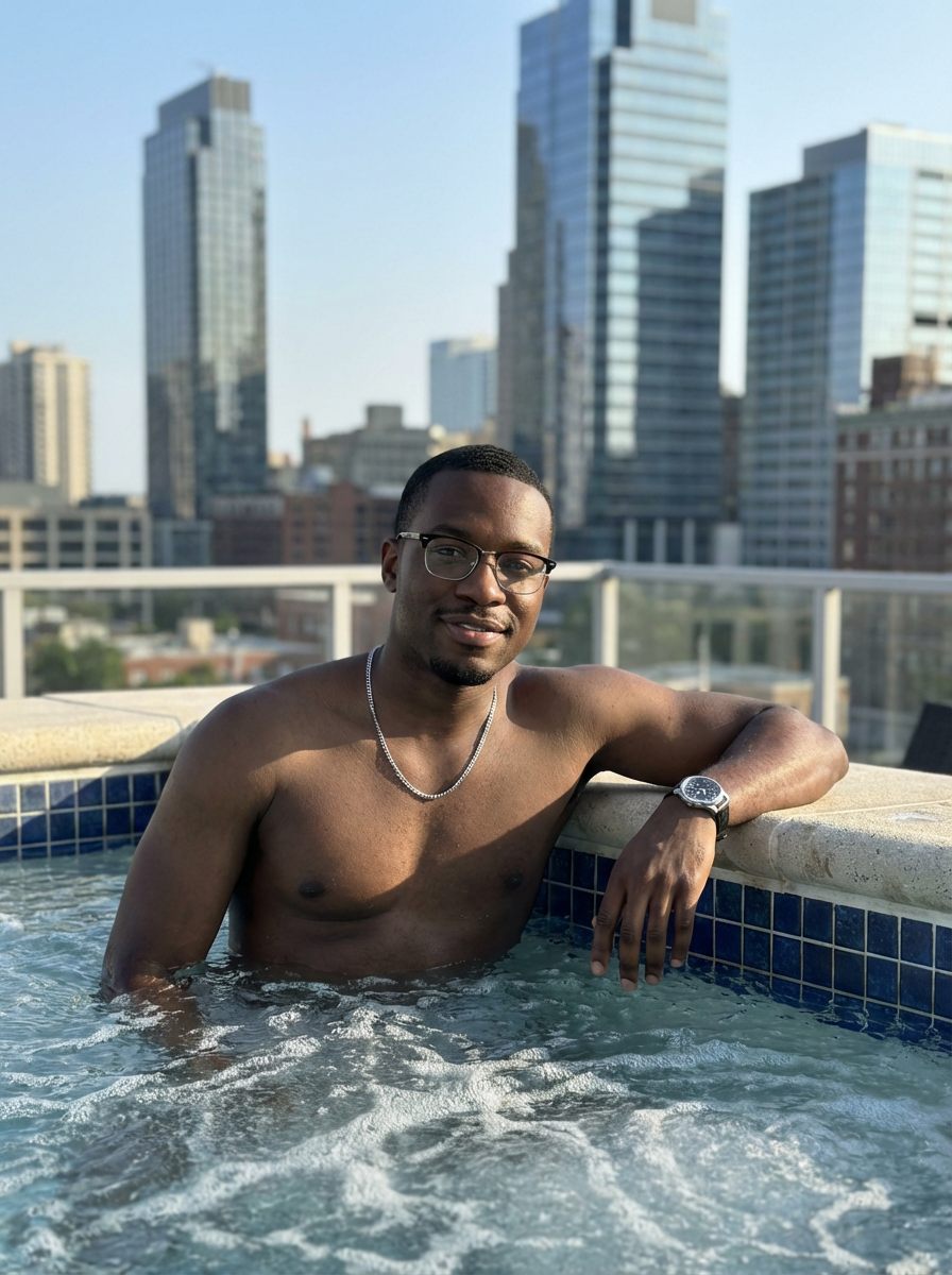 model relaxing in a rooftop jacuzzi with a modern city skyline in the background. mans leans casually on the edge of the jacuzzi, with water bubbling around them. The backdrop showcases tall skyscrapers and an urban environment under bright daylight, creating a luxurious, high-end vibe.