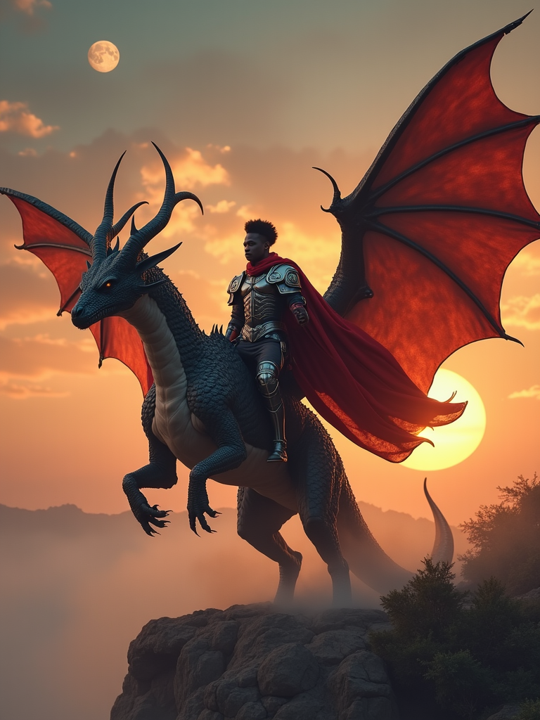 model riding a majestic dragon over a fantasy kingdom, wearing heroic fantasy armor with flowing cape, dramatic sunset sky with multiple moons visible