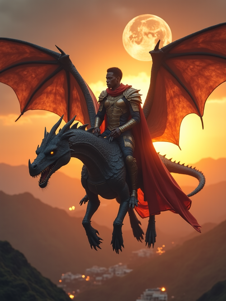 model riding a majestic dragon over a fantasy kingdom, wearing heroic fantasy armor with flowing cape, dramatic sunset sky with multiple moons visible