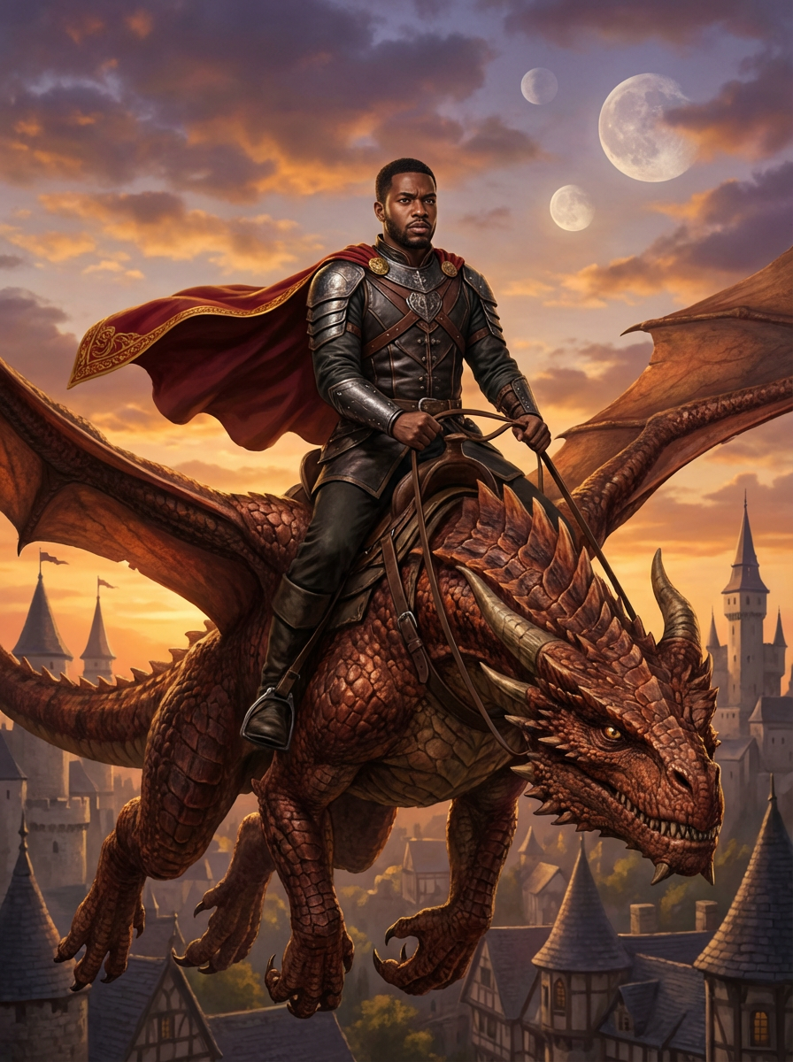 model riding a majestic dragon over a fantasy kingdom, wearing heroic fantasy armor with flowing cape, dramatic sunset sky with multiple moons visible