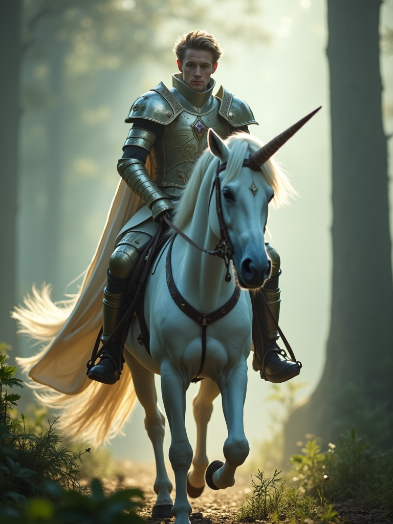model riding a majestic white unicorn through a misty enchanted forest, wearing noble fantasy armor with mystical elements, ethereal morning light creating a dreamlike atmosphere